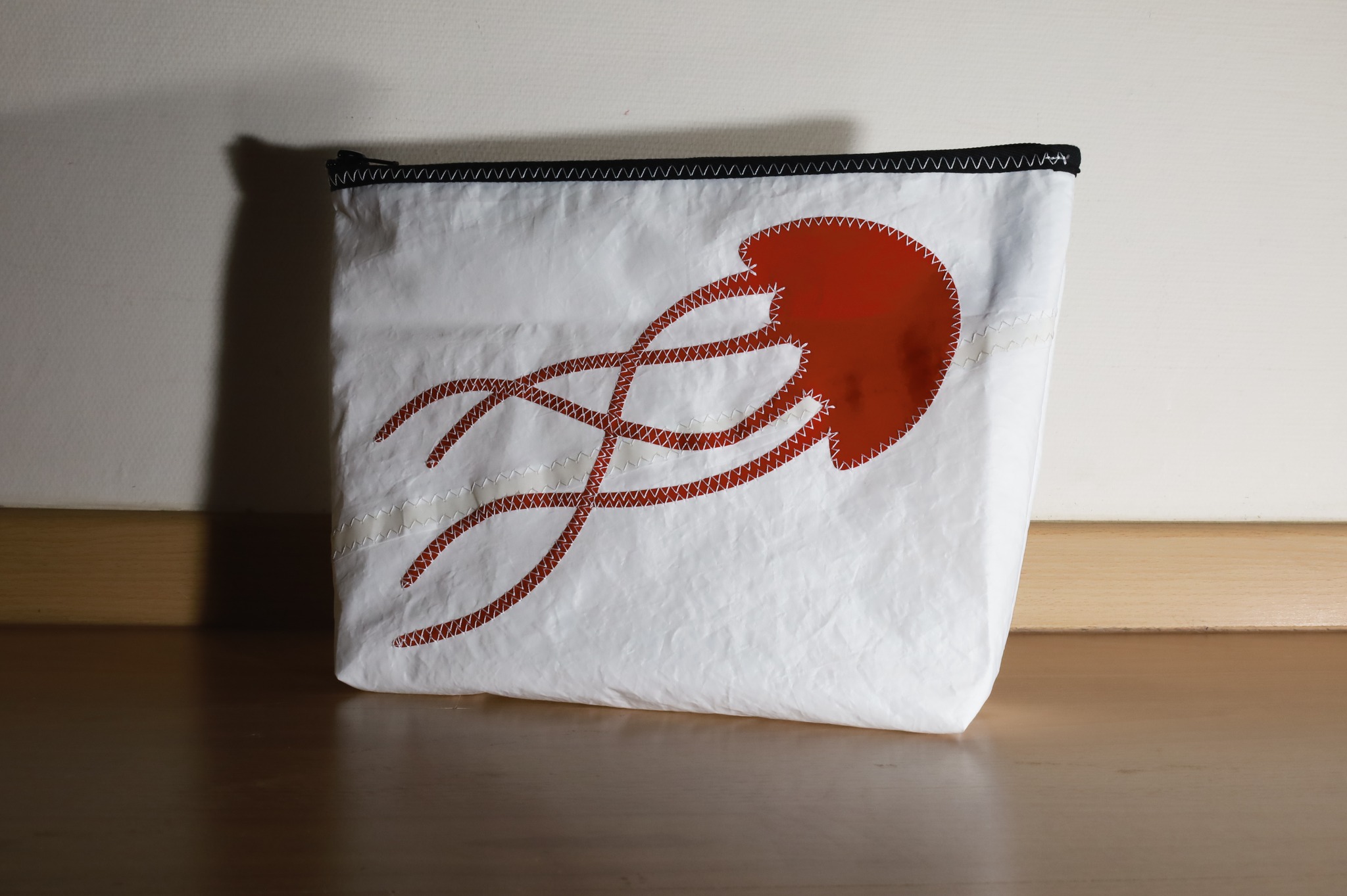 Unieke toilettas vervaardigd uit gerecycleerde Dacron van een grootzeil, de voering bestaat uit een stuk spinaker. 33cm breed, 22cm hoog, 10cm diep. Gevoerd en voorzien van een degelijke YKK ritssluiting.